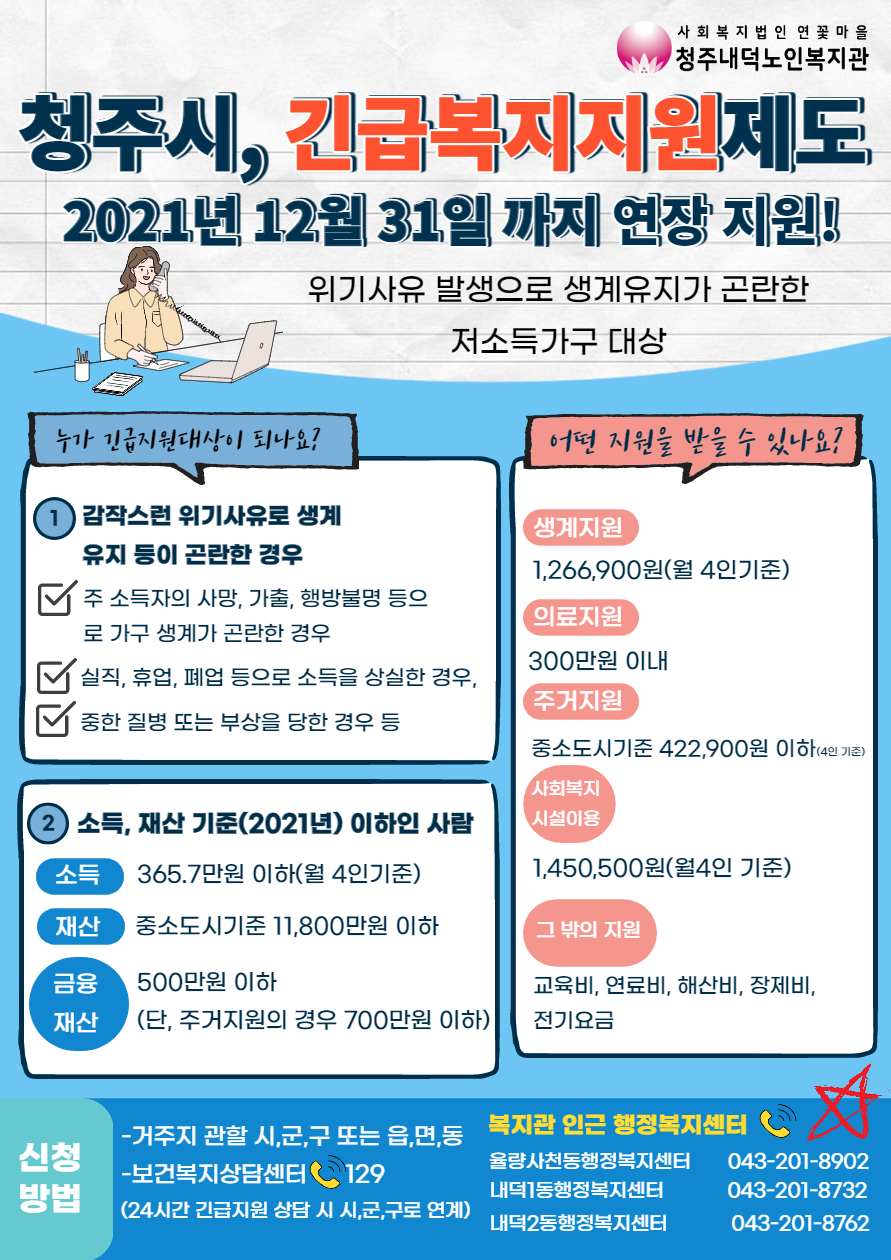 이달의 복지정책 소식! 청주시에서 긴급복지지원제도를 이달 말 12월 31일(금)까지 연장 지원한다고 합니다. 지원대상 자격을 확인하여 아직 신청하지 못하신 분들은 지금 보건복지상담센터 또는 거주지 관할 행정복지센터에 전화하여 신청하세요!