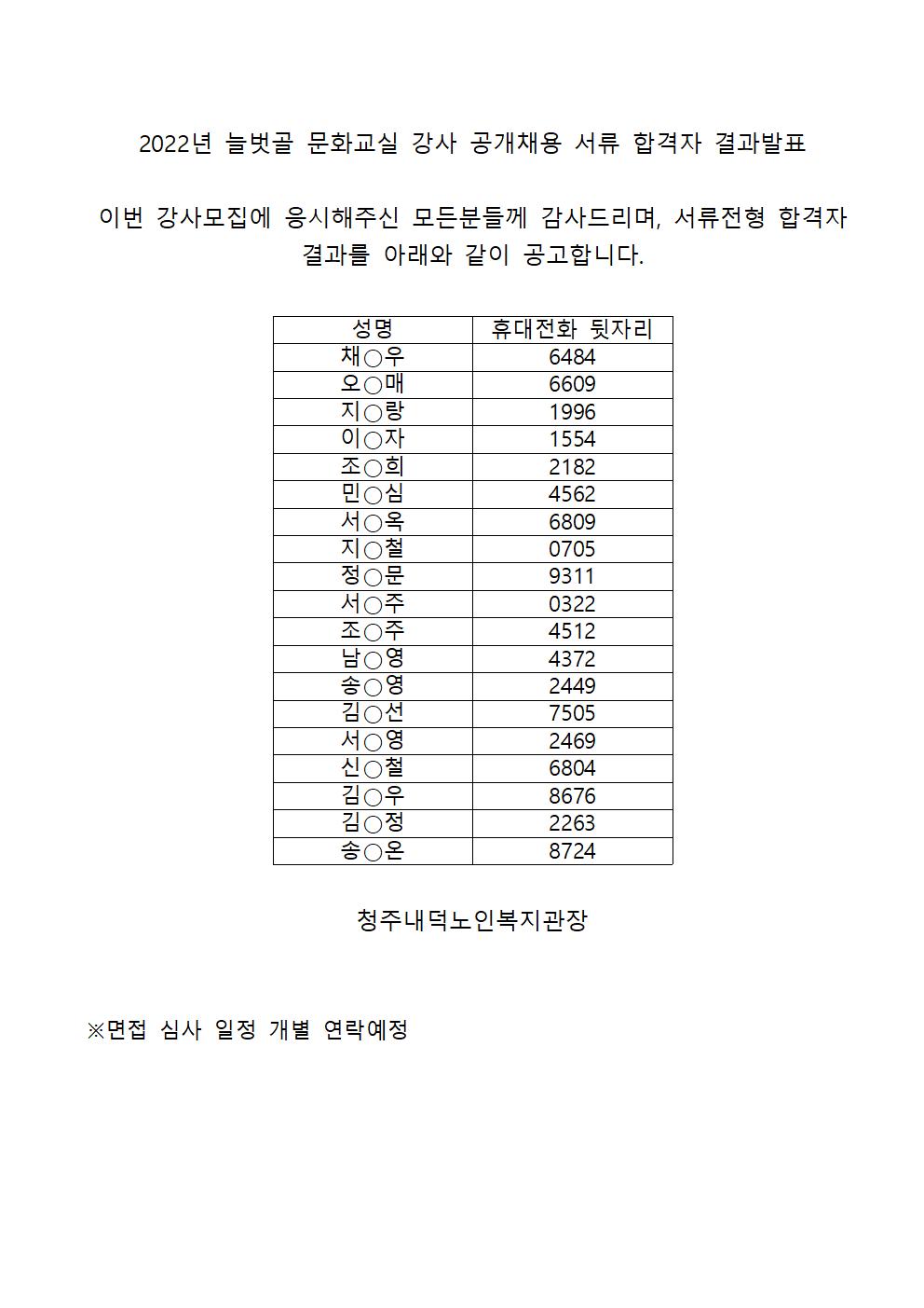 | 2022년 늘벗골 문화교실 강사 채용 서류 합격자 발표 | |||