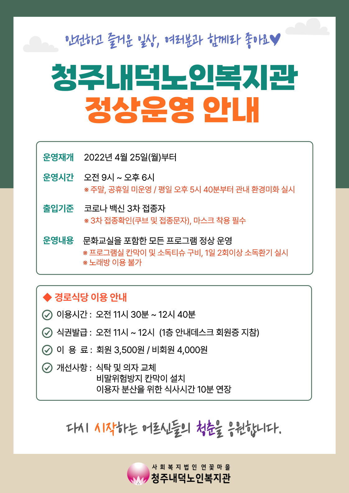 | 복지관 정상운영 안내(2022년 4월 25일 기준) | |||