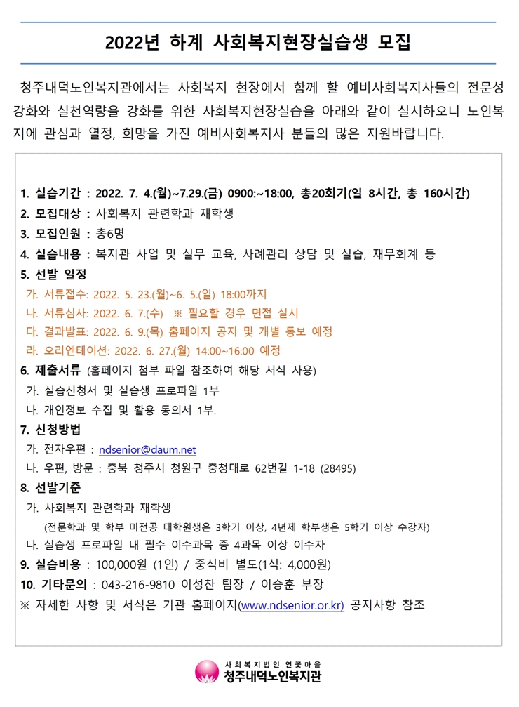 | 2022년 하계 사회복지현장실습생 모집 공고 | |||
