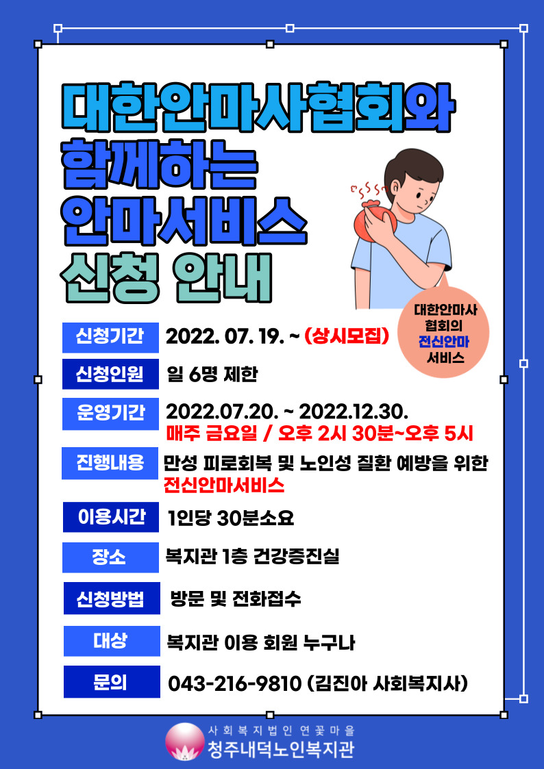 자세한 내용은 위의 안내문을 확인하여 주시고 복지관으로 방문하여 접수해 주시길 바랍니다. 만성 피로회복 및 노인성 질환 예방을 위한 전신안마서비스를 제공하오니 많은 관심과 참여 부탁드립니다~~!