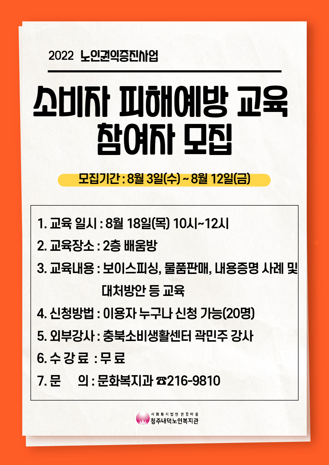 본 기관은 8월 한달간 여름방학을 들어가게 되었습니다~! 방학기간 중에도 저희 기관은 어르신들의 권익증진을 위하여 소비자 피해예방교육을 진행하고자 합니다 충북소비생활센터의 지원으로 보이스피싱, 물품판매, 내용증명 사례 및 주의사항, 대처방안에 대한 교육을 실시 하고자 하오니 많은 관심과 참여 바랍니다