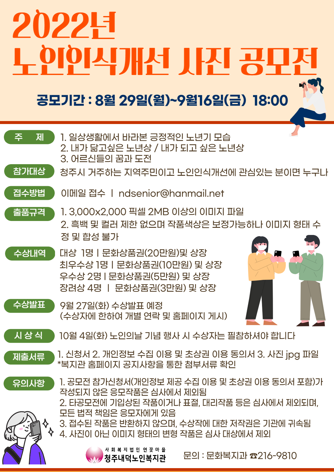 10월 2일 노인의날을 맞이하여 노인인식개선 사진 공모전을 개최하게 되었습니다 청주시에 거주하는 지역주민이면 누구나 신청이 가능하오니 지역주민들의 많은 관심과 참여 바랍니다 자세한 내용은 첨부된 공고문 파일을 확인하여 주시길 바라며 양식을 참고하여 기관메일 ndsenior@hanmail.net 으로 보내주시길 바랍니다. 감사합니다~! |