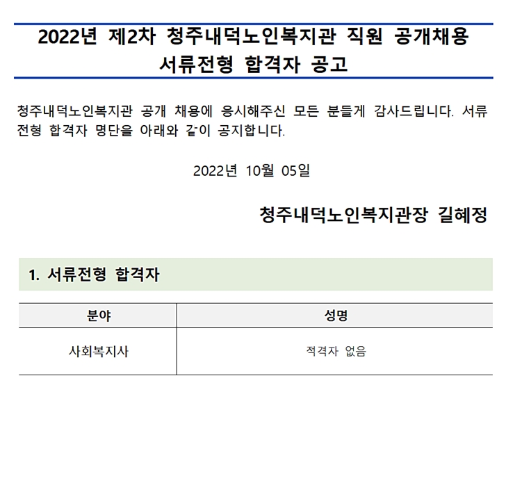 | 2022년 제2차 직원 공개채용 서류전형 합격자 공고 | |||