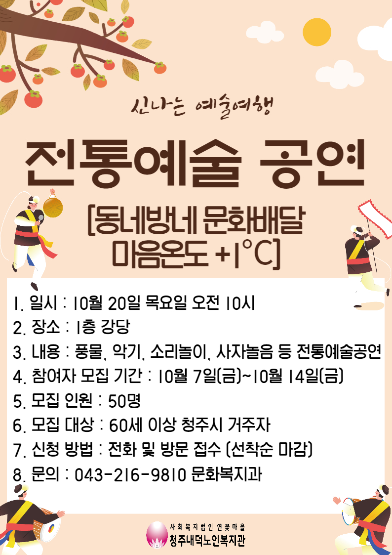 10월 7일(금) ~ 10월 14일(금) 기간 동안 전통예술공연 참여자 모집을 합니다. 공연은 10월 20일(목) 10시에 진행되며, 풍물, 악기, 소리놀이 등 다양한 공연이 준비되어있으니 많은 관심부탁드립니다. 신청 및 문의 사항 있을 시 사무실로 방문해주시거나 전화부탁드립니다. |