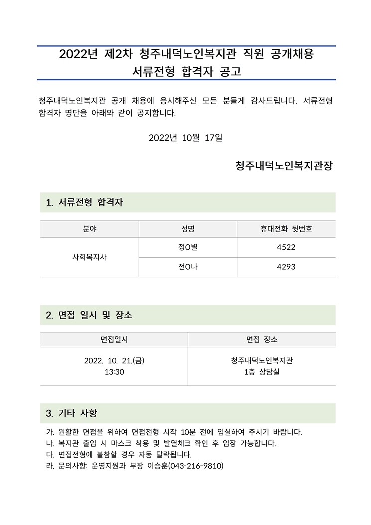 | 2022년 제2차 직원 공개채용 서류전형 합격자 및 면접시간 안내 | |||