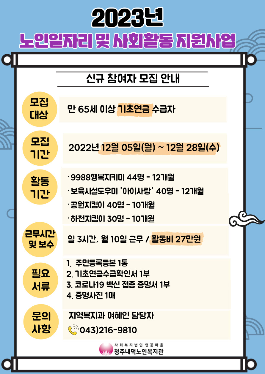 | [모집] 2023년 노인일자리 및 사회활동지원사업 신규 참여자 모집 안내 | |||