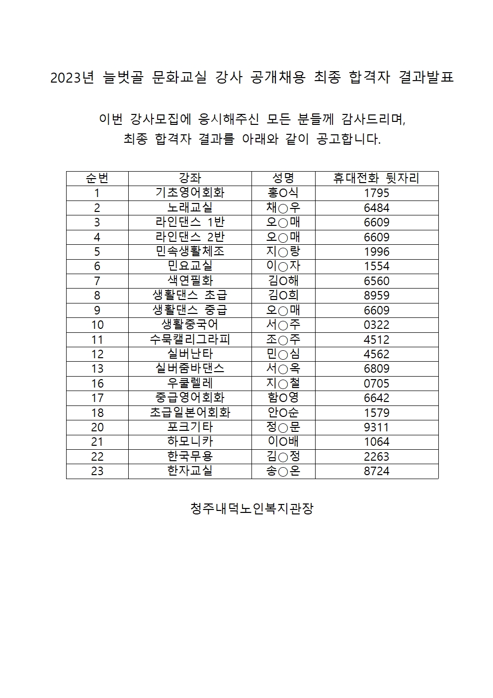 | 2023년 늘벗골 문화교실 강사 채용 공고 및 재공고 최종 합격자 발표 | |||