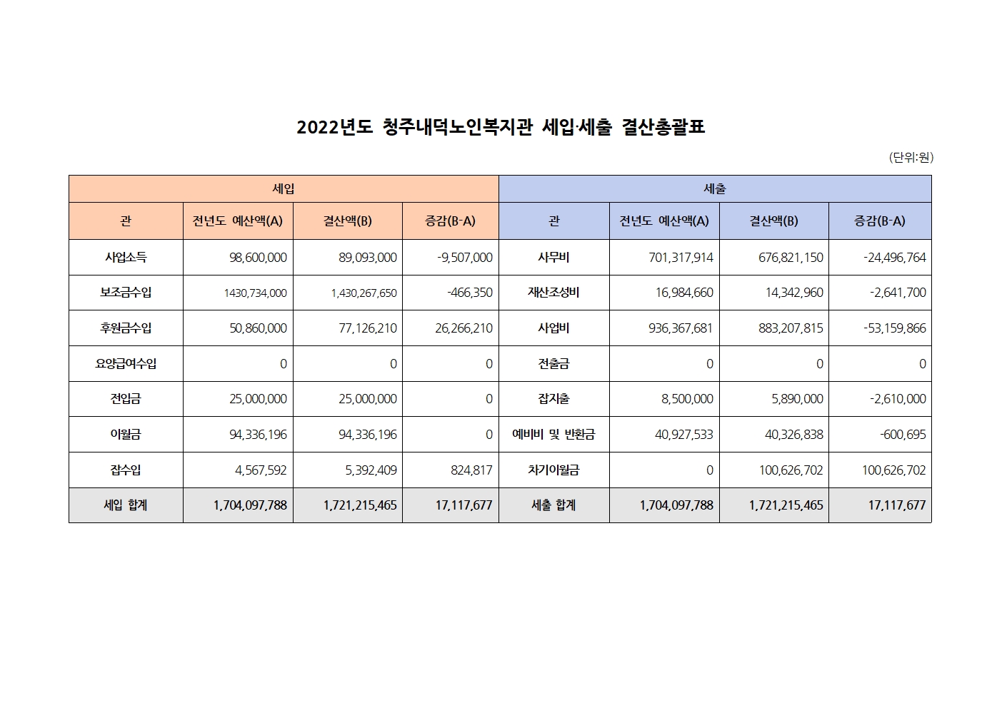 2022년도 청주내덕노인복지관 세입 세출 결산 공고