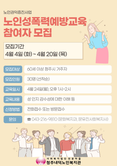 | [모집] 노인권익증진사업 - 노인성폭력예방교육 참여자 모집 | |||