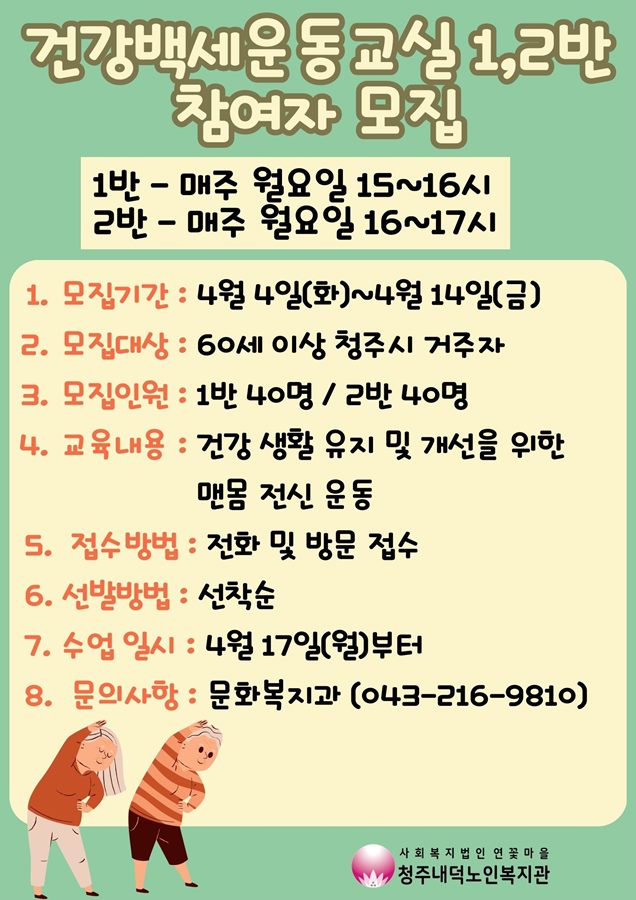 | [모집] 건강백세운동교실 1, 2반 참여자 모집 | |||