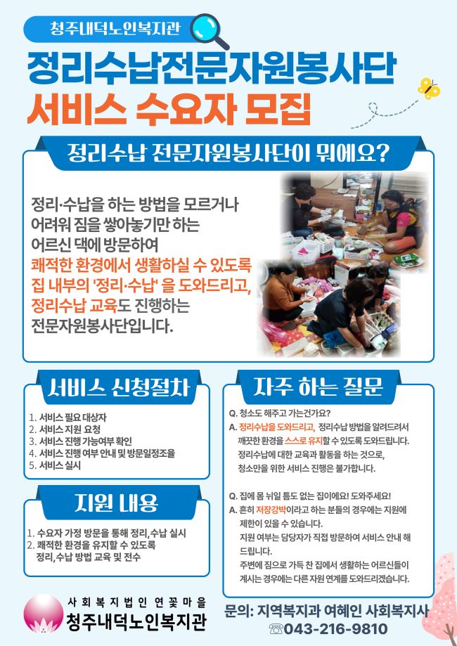 4/13(목) ~ 4/28(목) 기간동안 정리수납 전문자원봉사단 서비스 수요자를 모집합니다. 정리, 수납에 대한 어려움을 겪고 계신 어르신을 대상으로 정리수납 전문자원봉사자분들이 주거 환경 개선 활동을 진행하며, 어르신께서 지속적으로 깨끗한 환경을 유지하실 수 있도록 정리 수납 방법에 대한 교육도 지원해드릴 예정입니다~! 관심있으신 분들은 복지관 사무실 방문 또는 전화(043-216-9810)로 문의 부탁드립니다~