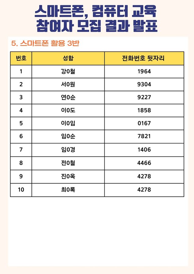| [모집결과] 2023년 스마트폰, 컴퓨터 교육 참여자 모집 결과 안내 | |||