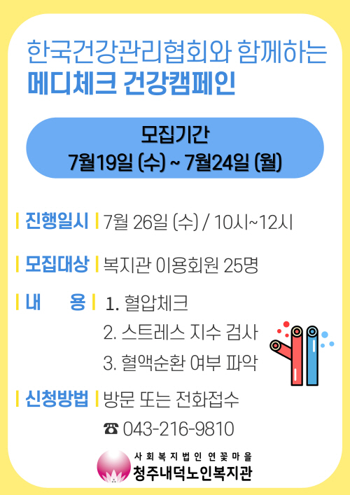 청주내덕노인복지관에서는 7월26일 수요일, 오전10시부터 12시까지 한국건강관리협회 충북세종지부 메디체크와 함께 건강캠페인이 진행 예정입니다.