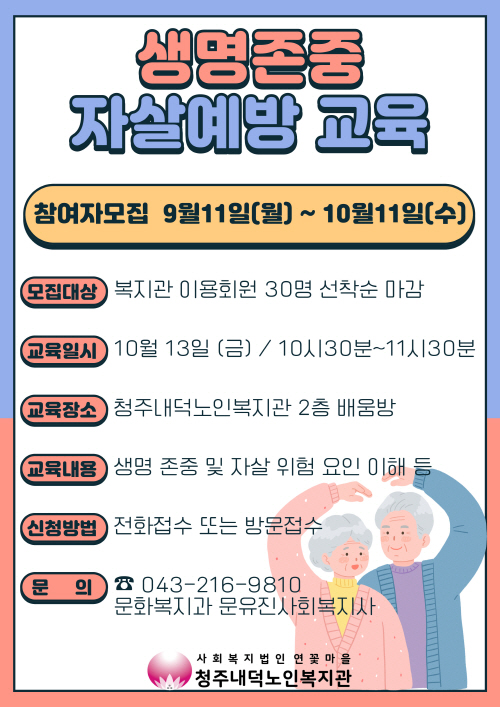 청주내덕노인복지관에서는 10월13일 금요일, 오전10시30분부터 11시30분까지 청원정신건강복지센터와 함께 생명존중, 자살예방교육이 진행됩니다.
