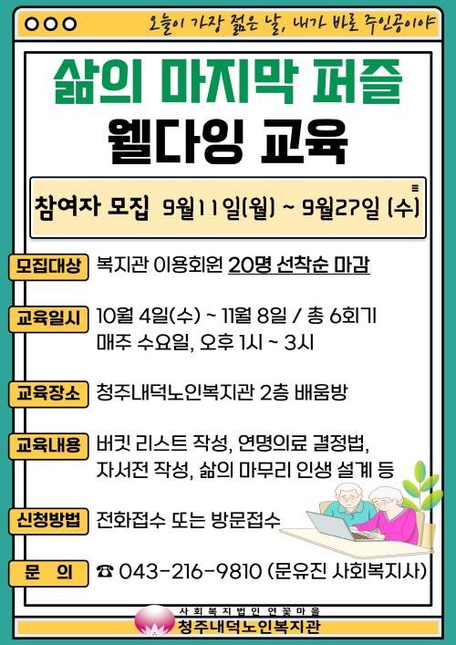 청주내덕노인복지관에서는 10월4일부터 11월8일 오후 1시부터 3시까지, 매주 수요일 총 6회기 동안 대한웰다잉협회와 함께 웰다잉 교육 집단상담이 진행됩니다.