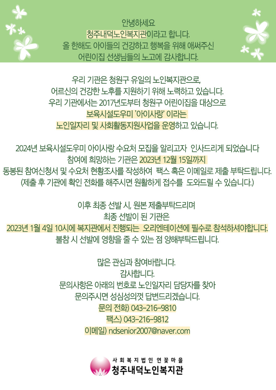 | 2024년 노인사회활동지원사업 보육시설도우미 ‘아이사랑’ 수요처 모집 안내 | |||