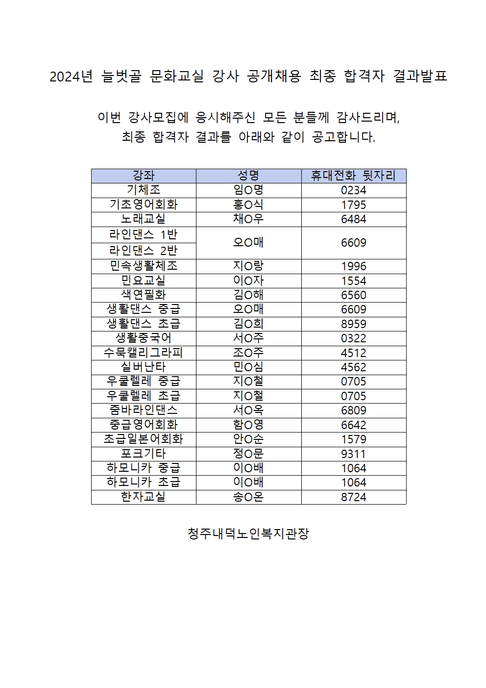 | 2024년 늘벗골 문화교실 강사 채용 공고 최종 합격자 발표 | |||