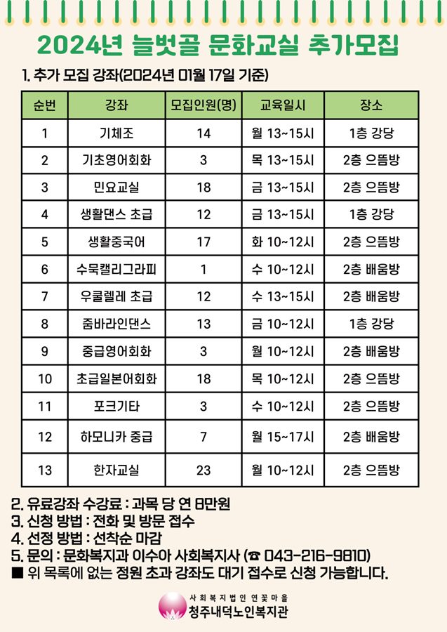 | [모집] 2024년 늘벗골 문화교실 추가 모집 | |||