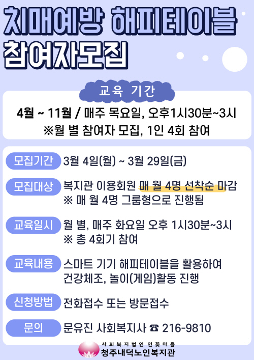 | [모집] 2024년 치매예방교실 - 해피테이블 참여자 모집 | |||