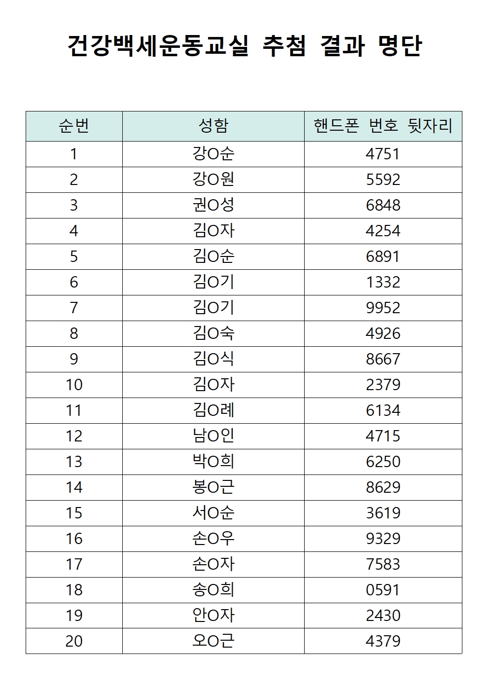 | 2024년 건강백세운동교실 추첨 결과 공지 | |||