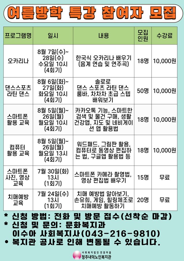 여름방학특강을 진행하여 참여자를 모집합니다. 오카리나, 댄스스포츠 라틴댄스, 스마트폰 활용교육, 컴퓨터 활용 교육, 스마트폰 사진, 영상 교육, 치매예방 교육 6개 강좌를 운영할 예정이며, 각 강좌별로 선착순 마감하오니 관심 있으신 분들은 사무실 방문 신청 또는 전화로 문화복지과 이수아 사회복지사(043-216-9810)를 찾아주시길 바랍니다. |