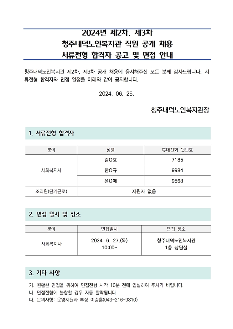 | 2024년 제2차, 제3차 직원 공개채용 서류전형 합격자 및 면접 안내 | |||