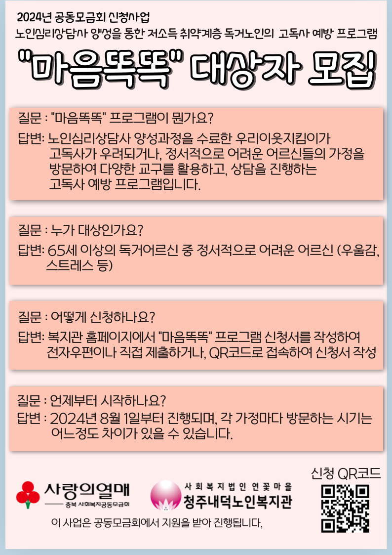 청주내덕노인복지관에서는 2024년 공동모금회 신청사업 "우리이웃지킴이"사업의 고독사 예방 프로그램인 "마음똑똑" 프로그램의 대상자를 모집합니다.
