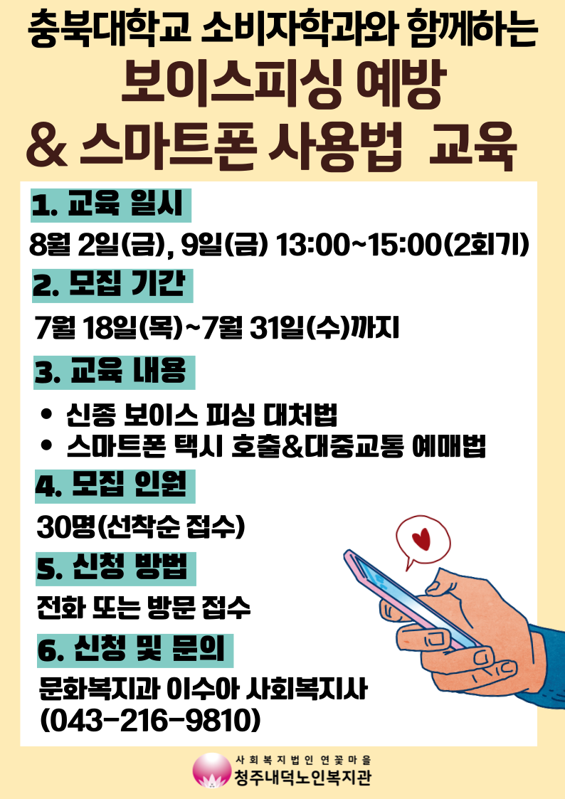 참여자를 모집합니다. 8월 2일(금), 8월 9일(금), 2회기에 걸쳐 충북대학교 소비자학과 학생들이 신종 보이스피싱 예방법 및 스마트폰으로 택시 호출, 대중교통 예매하는 법에 대해 교육을 진행해줄 예정입니다. 7월 31일(수)까지 선착순 30명을 모집하오니 관심 있으신 분들은 복지관 1층 사무실 방문하여 신청하시거나 전화(043-216-9810)로 신청 가능합니다. 많은 관심과 참여 부탁드립니다! |