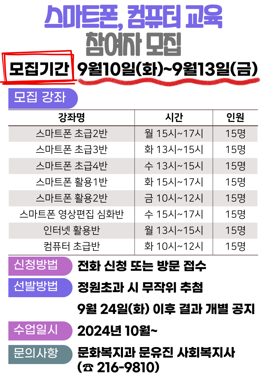 | [모집] 2024년 스마트폰, 컴퓨터 교육 참여자 모집 | |||