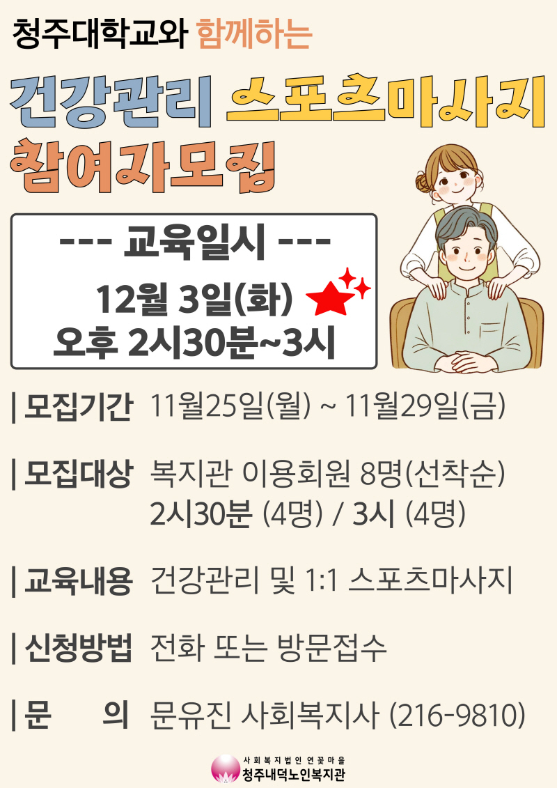 청주내덕노인복지관에서는 12월 3일(화) 오후 2시30분부터 3시까지 청주대학교 학생들과 함께 건강관리교육 및 스포츠마사지가 진행됩니다. 참여자 모집은 2시30분 4명, 3시 4명으로 총 8명 선착순 마감으로 진행됩니다. 자세한 내용은 상단의 사진을 참고해주시고 문의사항은 문화복지과(043-216-9810) 를 찾아주세요.