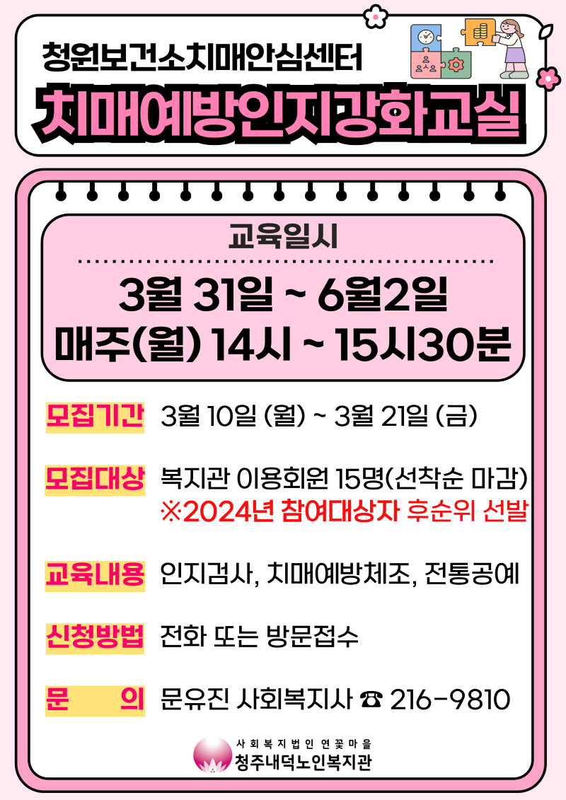 | [모집] 2025년 청원보건소치매안심센터 연계 치매예방인지강화교실 참여자모집 | |||