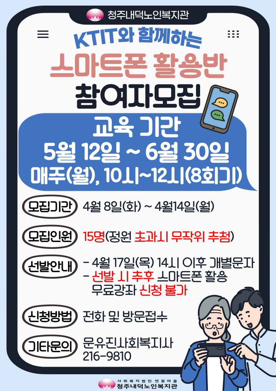 KTIT와 함께하는 스마트폰 활용반 참여자를 모집합니다. 5월12일부터 6월30일까지 총 8회기 진행됩니다. 모집기간은 4월14일까지이며 총 15명 모집합니다. 청원 초과시 무작위 추첨 진행되며 추첨결과는 4월17일 목요일 14시 이후 개별 안내 예정이며 교육 참여 시 추후 스마트폰 활용반 무료 수강 중복은 불가하니 참고바랍니다. 자세한 내용은 사진을 참고해주시고 문의사항은 문화복지과(043-216-9810) 문유진사회복지사를 찾아주세요. |