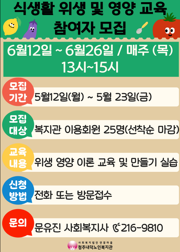 2025년 어르신 건강을 위한 식생활 위생 및 영양 교육 참여자를 모집합니다.