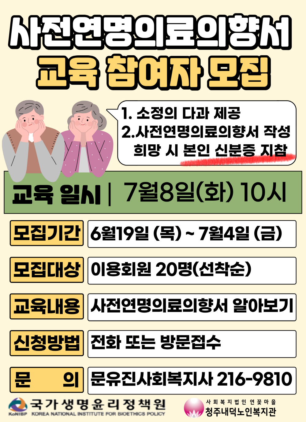 청주내덕노인복지관에서는 7월 8일(화) 오전 10시부터 사전연명의료의향서에 대한 교육이 진행됩니다.