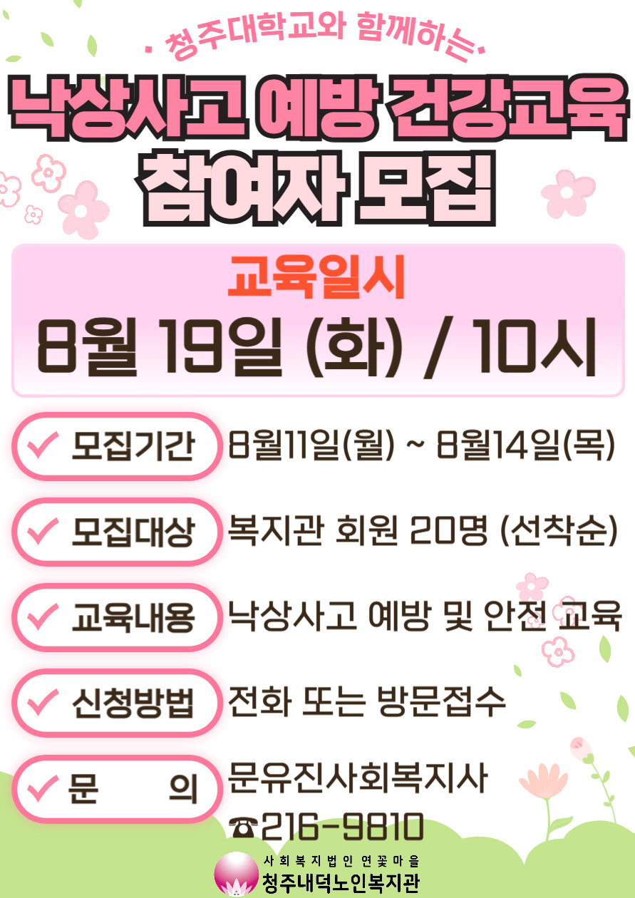 청주내덕노인복지관에서는 8월 19일(화) 오전 10시부터 청주대학교와 함께하는 낙상사고 예방 건강교육이 진행됩니다.