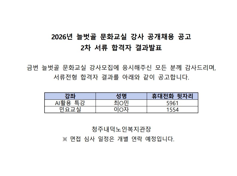 | 2026년 늘벗골 문화교실 강사 공개채용 추가 및 재공고 서류 합격 결과 발표 | |||