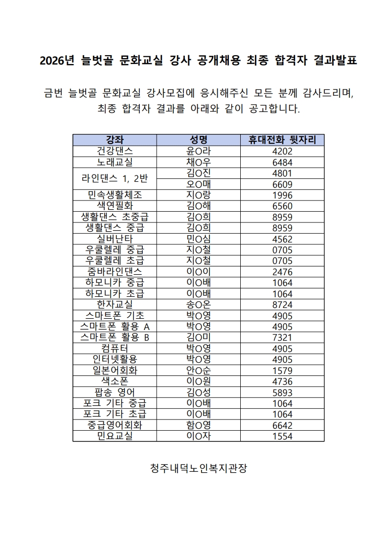 | 2026년 늘벗골 문화교실 강사 공개채용 최종합격자 결과발표 | |||