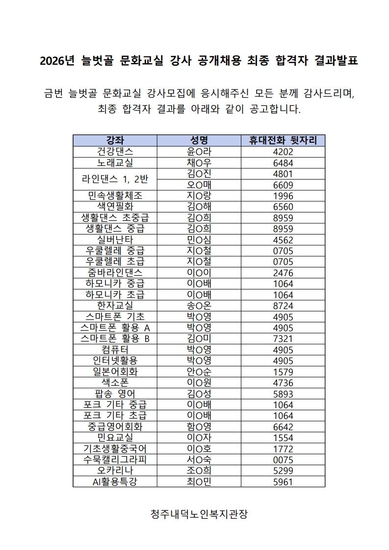 2026년 늘벗골 문화교실 강사 공개채용 최종 합격자 결과발표(1,2차 포함)