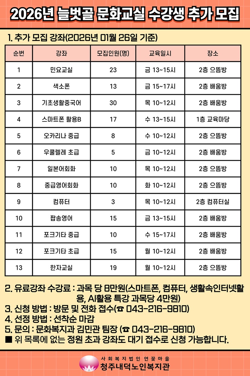 [모집] 2026년 늘벗골 문화교실 수강생 추가모집 안내(01.26기준)