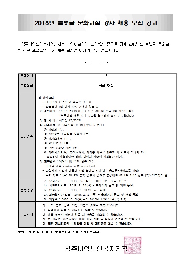 | [공고] 2018년 늘벗골 문화교실 평생교육 취미여가지원사업 영어중급 강사 공개채용 모집 공고 | |||