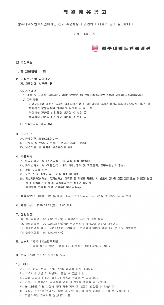 | 2019년도 제1차 신규직원(사무원) 채용 공고 | |||