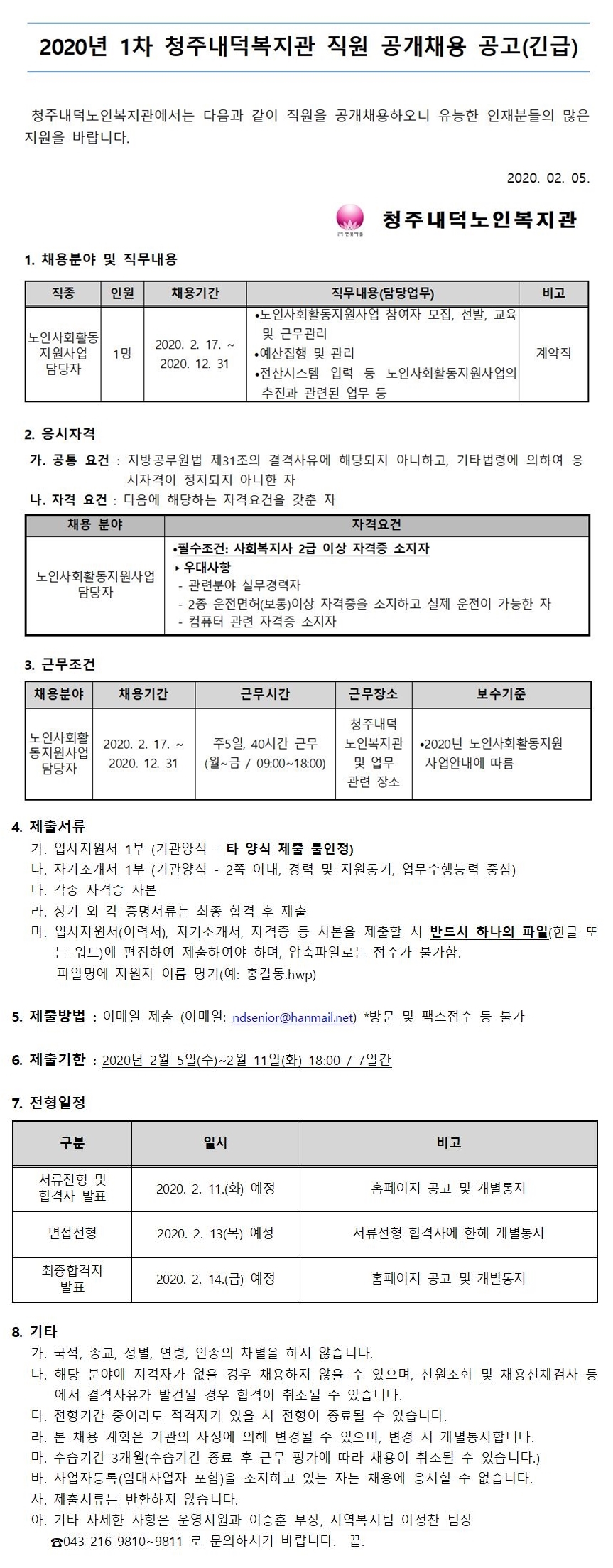 | 2020년 1차 청주내덕복지관 직원 공개채용 공고(긴급) | |||