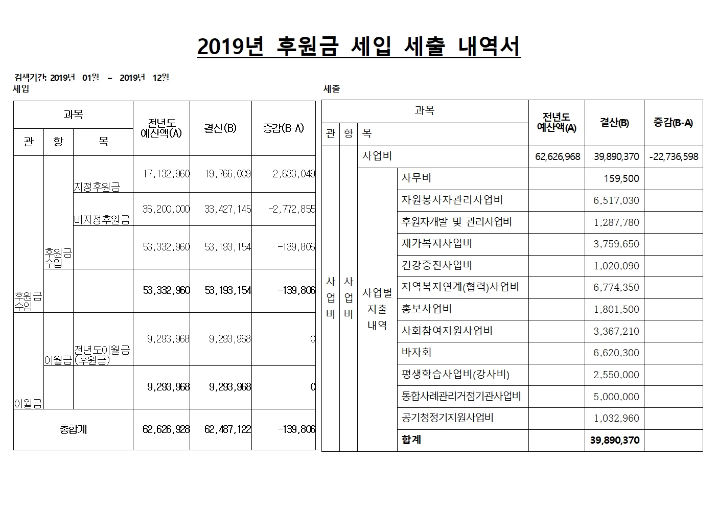 | 2019년도 후원금(품) 수입 및 사용 결과보고 | |||