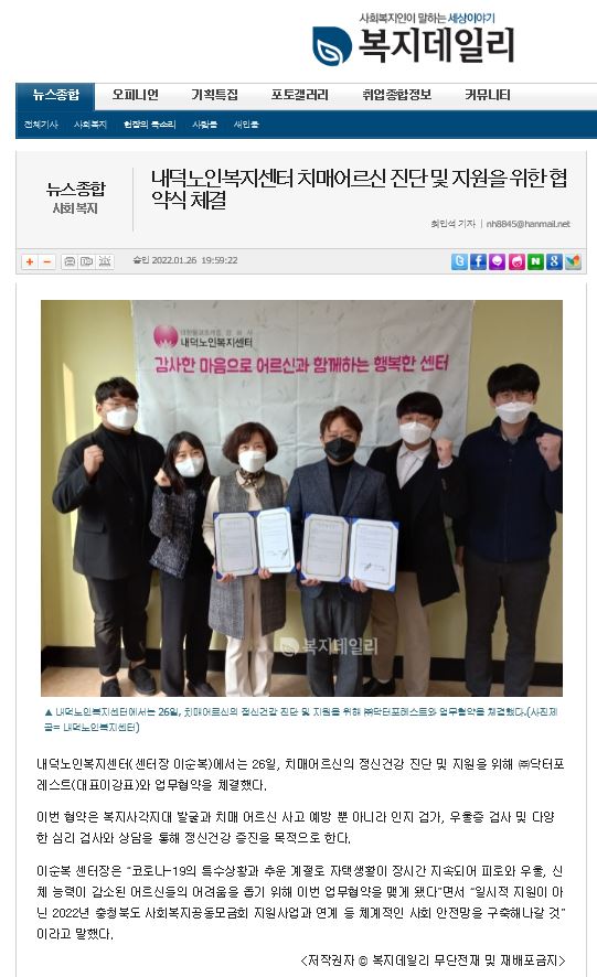 | 내덕노인복지센터 치매어르신 진단 및 지원을 위한 협약식 체결 | |||