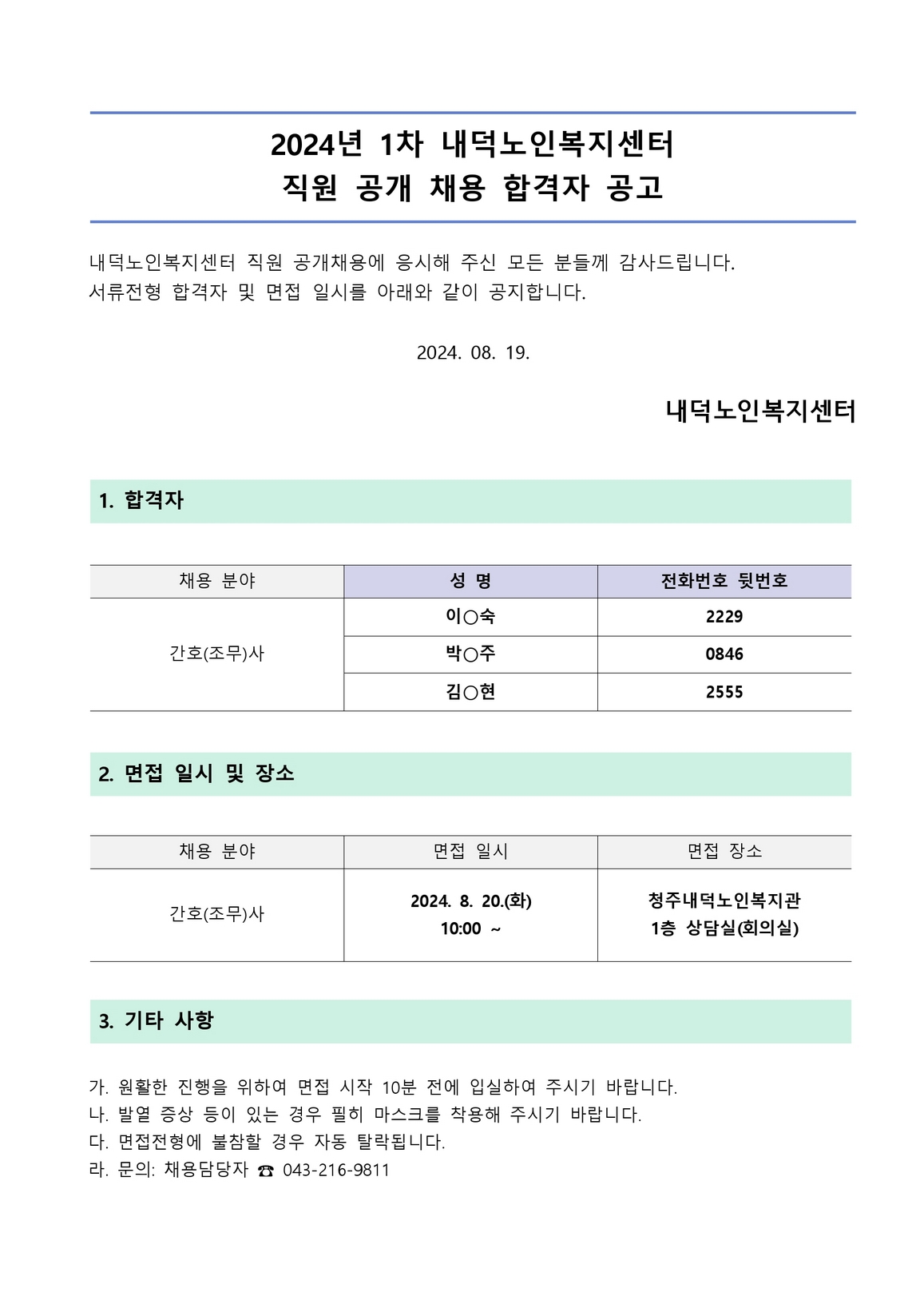 | 2024년 1차 내덕노인복지센터 직원 간호(조무)사 채용 공고 서류 전형 합격자 안내 | |||