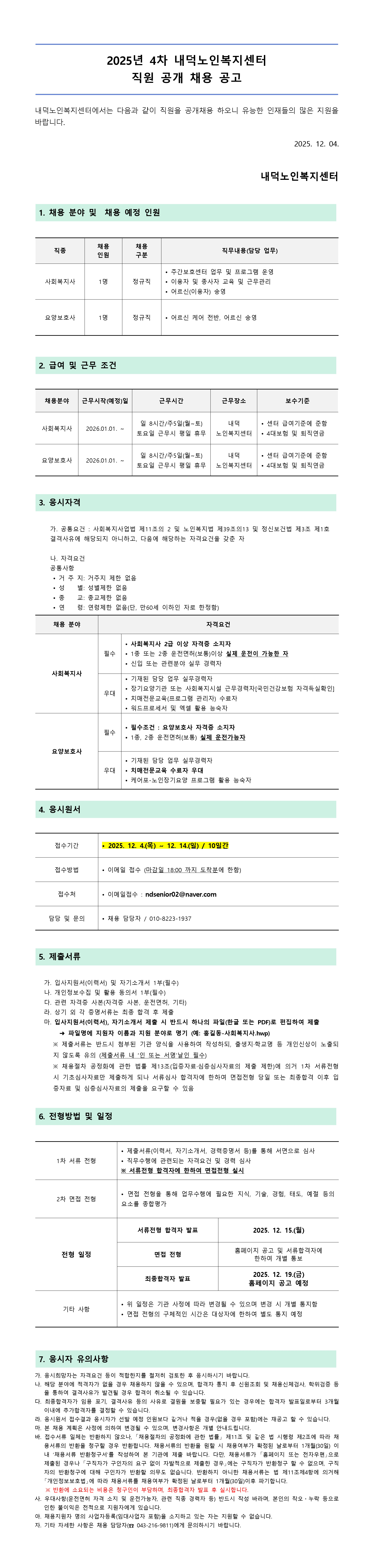 | 2025년 4차 내덕노인복지센터 직원 채용 공고 | |||