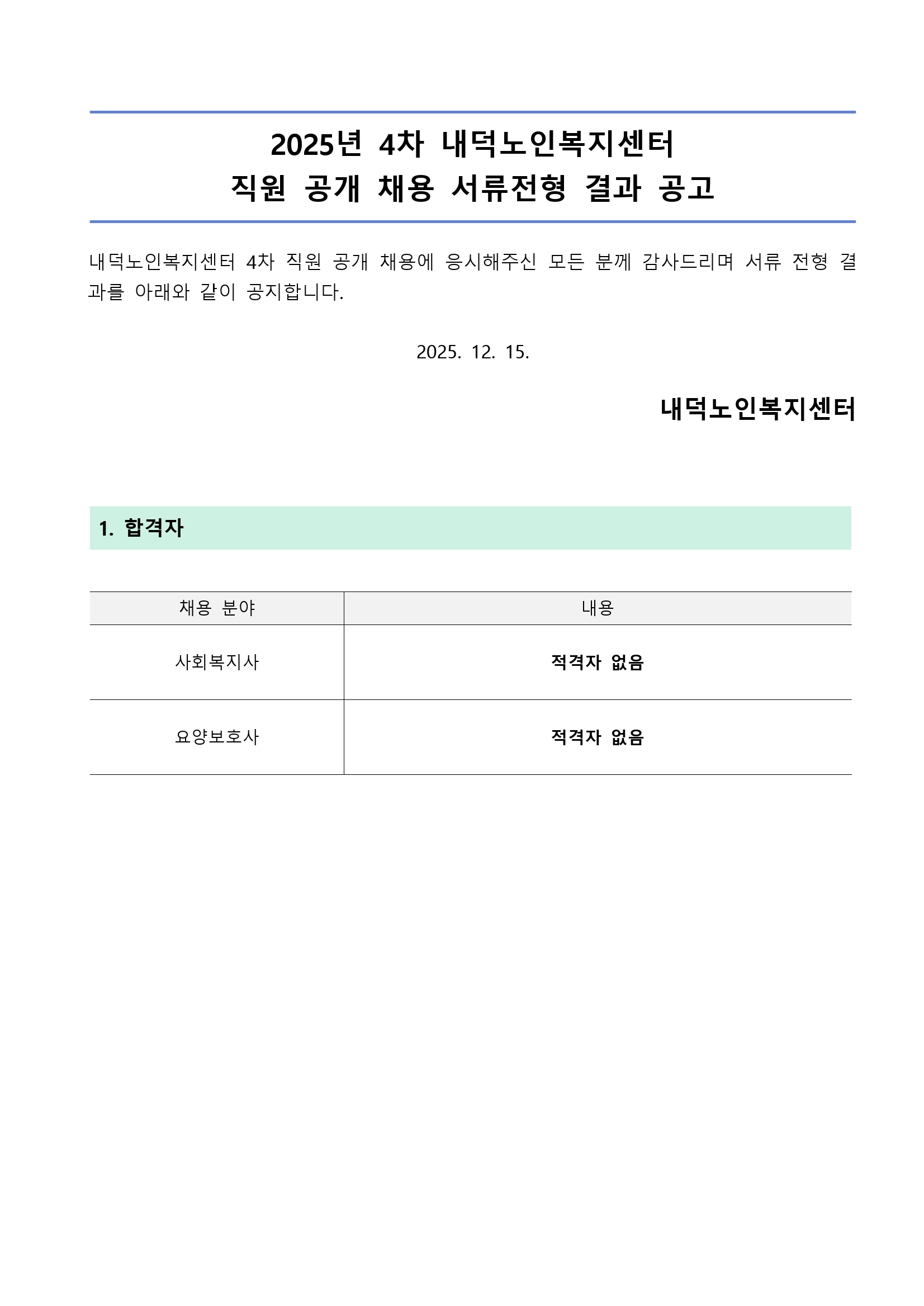 | 2025년 4차 내덕노인복지센터 직원 공개채용 서류 전형 결과 발표 | |||
