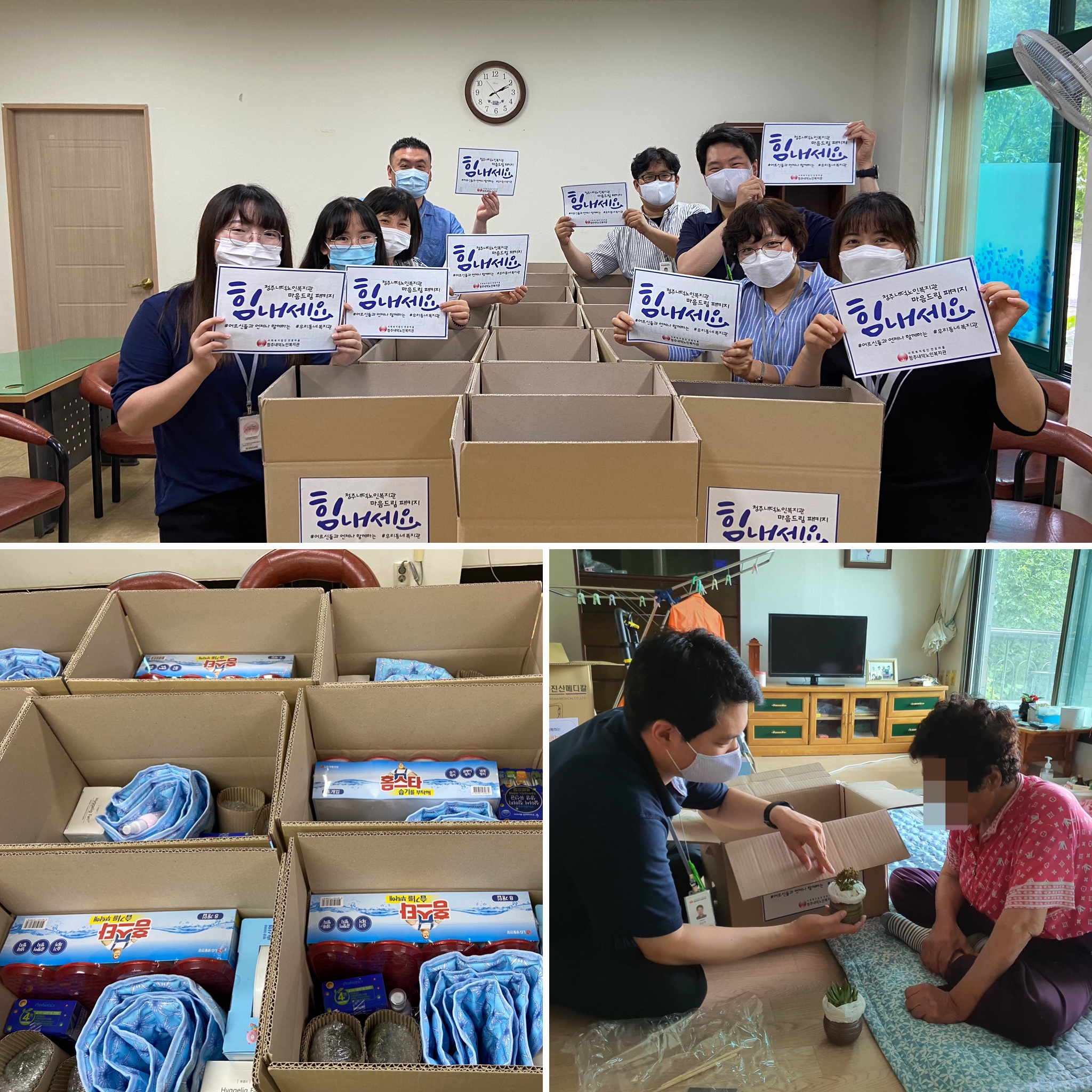 - 내용:여름철 더위 예방을 위한 손선풍기, 쿨매트와 다육식물, 콩나물 키트, 영양제 등 패키지 전달