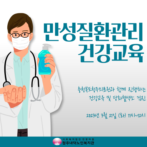 2023년 3월 21일(화) 11:00~12:00 복지관 2층 으뜸방에서 건강생활지원사업으로 만성질환관리 건강교육을 진행하였습니다.